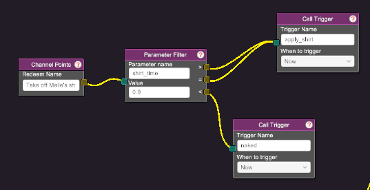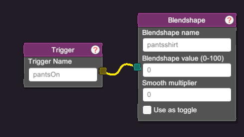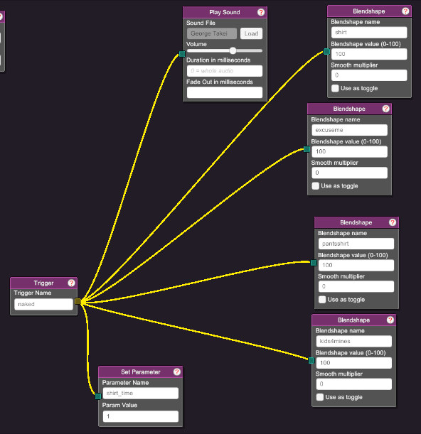 - when its time to not have a shirt, set all your blendshapes to 100 and also set your clothing toggle variable. You can also have addition effects when you are naked, like a sound effect