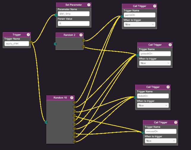 - Call that trigger in any way you so choose. If you’d like to pick it randomly, consider my setup (see how the “pantsOn” trigger is activated on 1 and 5. All outputs of Random 10 must be allocated since empty outputs are pickable and will lead to nothing happening